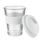 Gobelet en verre avec couvercle et poignée en silicone. Capacité 350 ml. Comme il s'agit d'une tasse à simple paroi, le transfert de chaleur peut encore se produire.