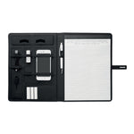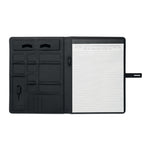 Conférencier A4 en lin et PU avec fermeture à fermoir. Chargement sans fil DC 5 V/1 A. Batterie externe 4000 mAh avec connecteur micro USB vers type C. Bloc-notes de 20 feuilles lignées. Porte-cartes. Porte-stylo. Plaque en aluminium noir idéale pour votre logo.
