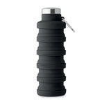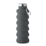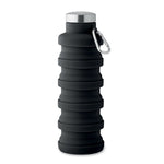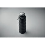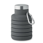 Bouteille pliable en silicone avec couvercle en acier inoxydable et mousqueton en aluminium. Le mousqueton n'est pas destiné à l'escalade (usage non professionnel). Capacité : 500 ml.