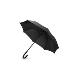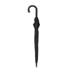 Parapluie coupe-vent à ouverture automatique de 58 cm en pongé 190T avec mât en métal plaqué noir. Baleines en fibre de verre noires et embouts en plastique noir. Poignée courbée en ABS caoutchouté noir avec bouton gris. Fermeture manuelle.