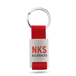 Porte-clés rectangulaire en métal avec sangle en polyester colorée. Emballé individuellement dans une boîte cadeau en carton.