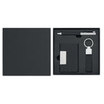 Coffret cadeau 3 pièces dans un coffret cadeau. Comprend un stylo bille en métal avec détails en polyester RPET, un porte-clés en polyester RPET et un porte-cartes en polyester RPET avec plaque métallique. Encre bleue.