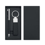 Découvrez le coffret cadeau Valence, un ensemble élégant de deux pièces comprenant un stylo à bille à mécanisme twist en métal orné de détails en polyester RPET, accompagné d’un porte-clés assorti également en polyester RPET. Pratique et durable, ce set utilise de l’encre bleue pour une écriture fluide, tout en valorisant des matériaux recyclés pour un impact environnemental réduit. Idéal pour offrir ou pour un usage professionnel raffiné.