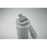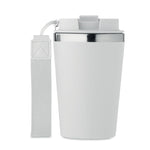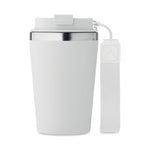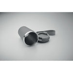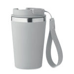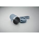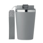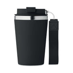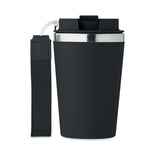 Gobelet double paroi en acier inoxydable recyclé (90 % acier inoxydable recyclé et 10 % acier inoxydable) avec revêtement extérieur en PP et dragonne en RPET. Capacité : 350 ml.