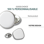 Épinglette carrée en bambou (30x30x3mm) avec épingle de sûreté métallique. Personnalisez-la avec votre motif en impression ou gravure. Emballage papier de soie standard ou carte couleur en polybag sur demande. Matériau naturel et durable pour un accessoire élégant et intemporel.