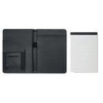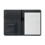 Conférencier A5 en RPET 300D bicolore. Bloc-notes A5 remplaçable. 40 pages blanches lignées en papier bambou (20 feuilles). Porte-stylo. Compartiments intérieurs pour cartes et un grand compartiment.